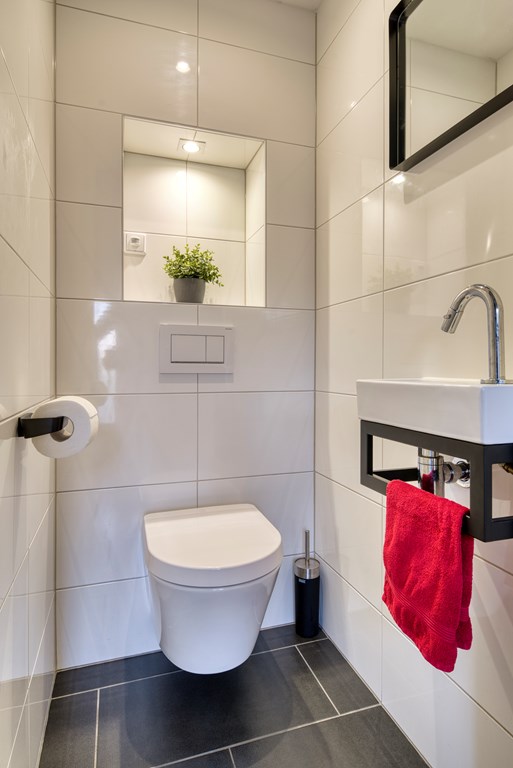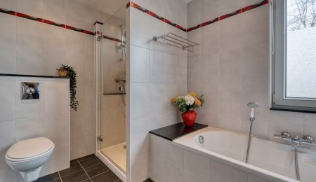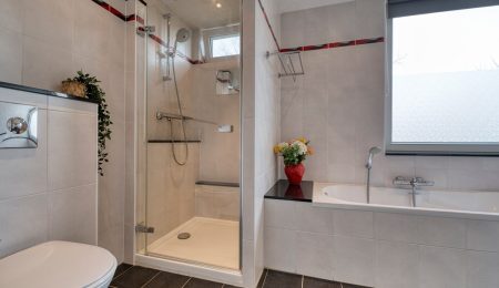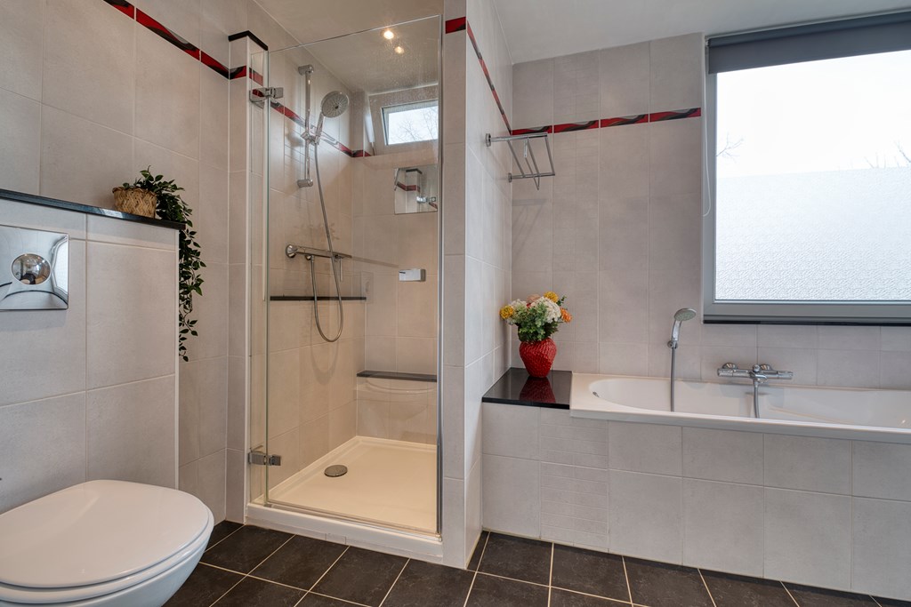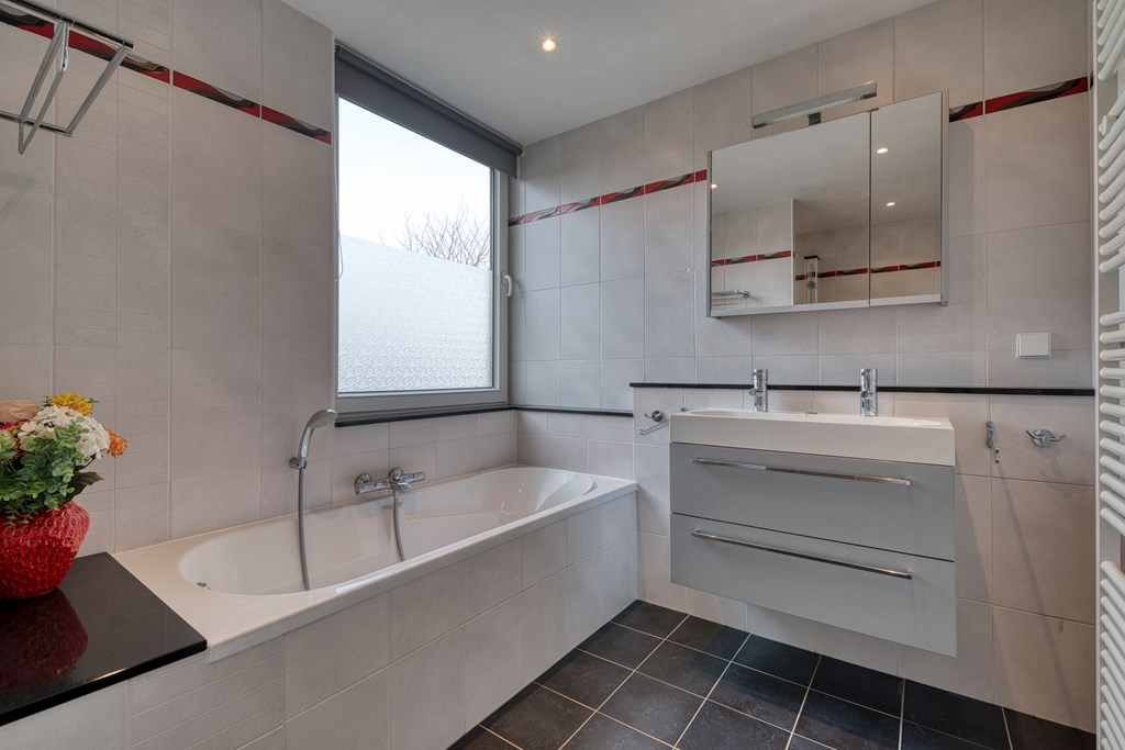 1e verdieping: De centrale overloop geeft toegang tot drie slaapkamers en de badkamer. Aan de achterzijde bevinden zich twee slaapkamers, waaronder de hoofdslaapkamer met een diepe inloopkast en extra bergzolder. Aan de voorzijde ligt de derde slaapkamer. De badkamer is compleet uitgevoerd en beschikt over een douchecabine, ligbad, toilet, dubbele wastafel met wastafelmeubel, designradiator en inbouwspots.