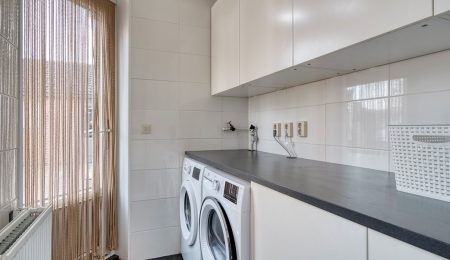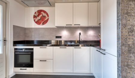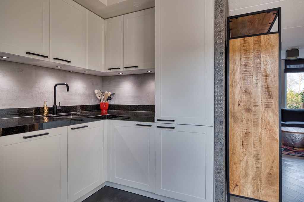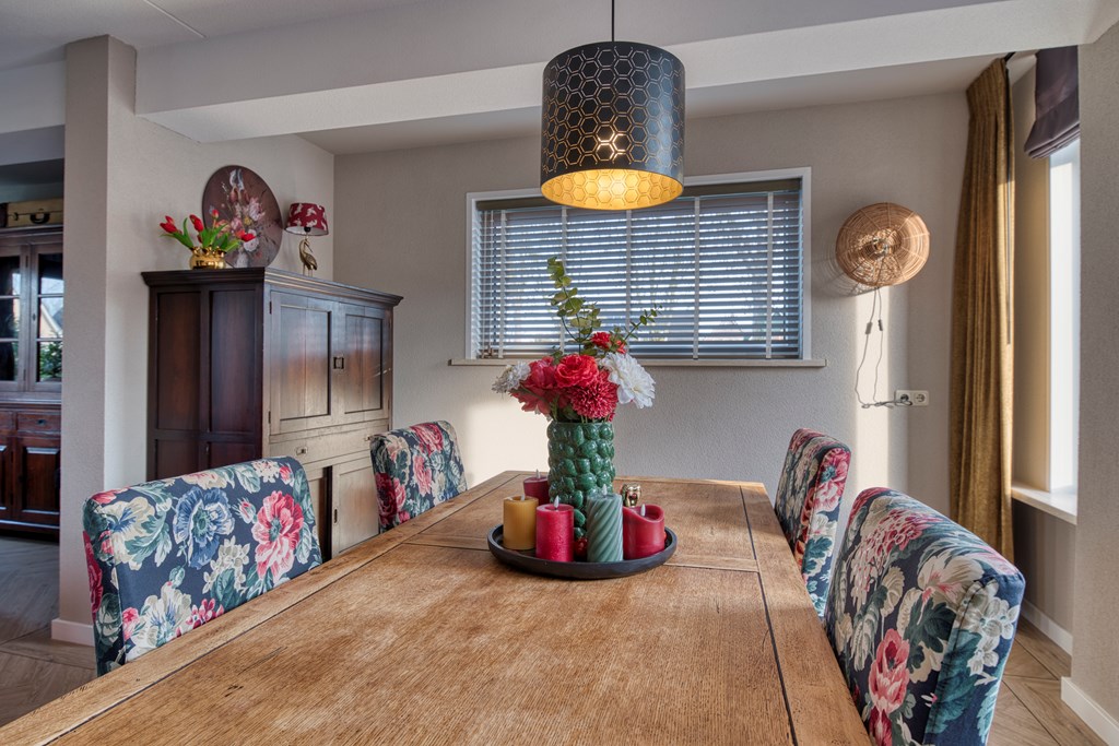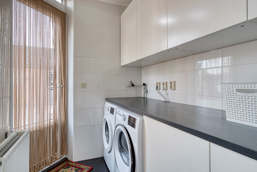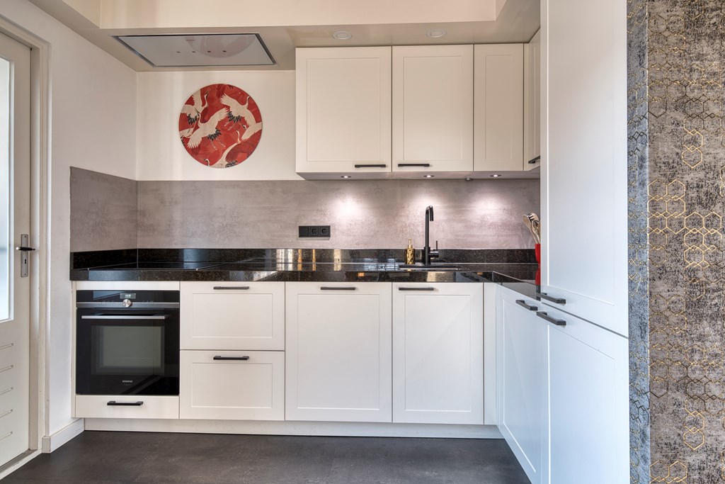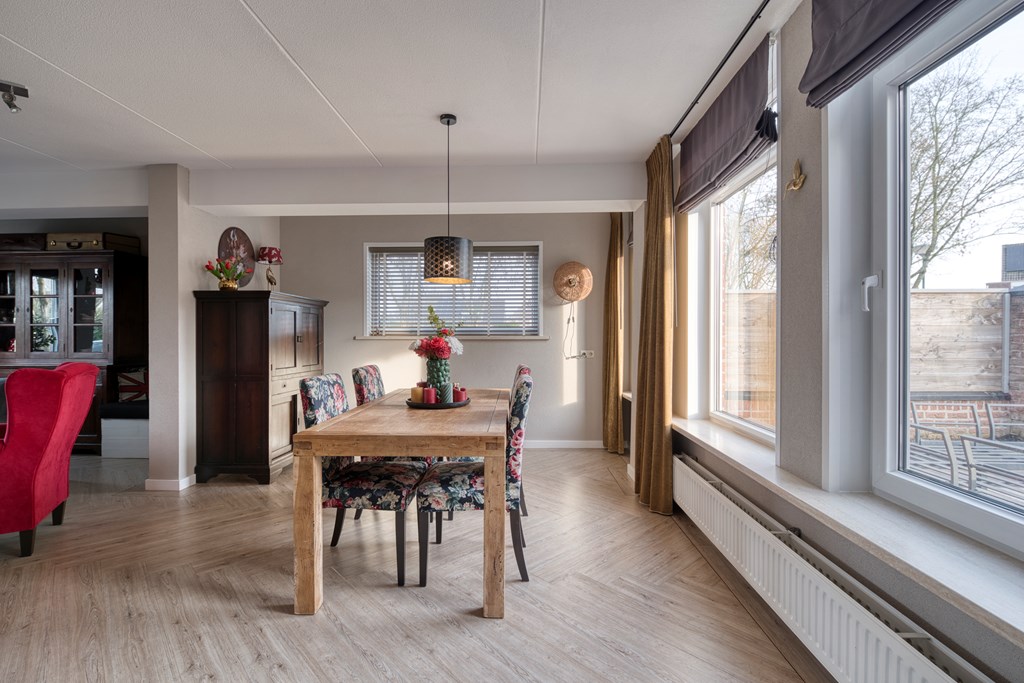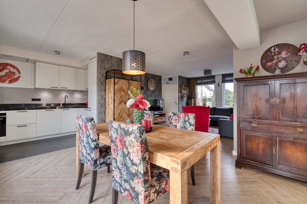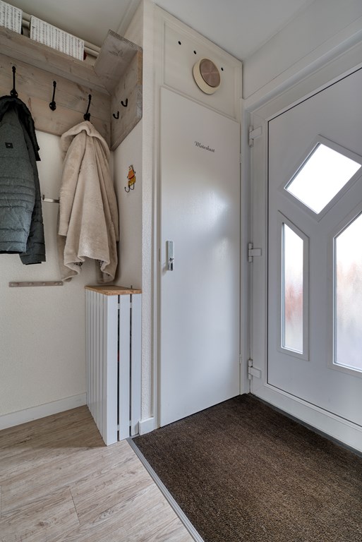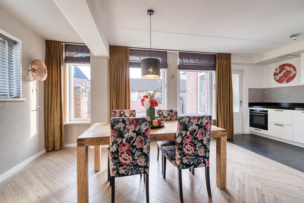 Begane grond: Via de voordeur komen we als eerste in de hal. Deze hal heeft deuren naar het toilet met een fonteintje en de meterkast. Vanuit de hal is er toegang tot de ruime, uitgebouwde woonkamer. Dankzij ramen aan drie zijden profiteert deze ruimte van bovengemiddeld veel lichtinval en een prettig vrij uitzicht aan de voorzijde. De woonkamer biedt volop ruimte voor een royale zithoek, een eethoek én eventueel een speelhoek of werkplek. De halfopen keuken (2022) is neutraal uitgevoerd en in een praktische hoekopstelling geplaatst. De keuken beschikt over hoog kwalitatieve inbouwapparatuur, waaronder een inductiekookplaat, afzuigkap, koelkast, vaatwasser en bakoven met magnetron. Direct naast de keuken bevindt zich de bijkeuken met vaste kastenwand, wasmachineaansluiting en ruimte voor een droger – een zeer praktische toevoeging in het dagelijks gebruik. Vrijwel de gehele begane grond is afgewerkt met een PVC vloer en voorzien van vloerverwarming.