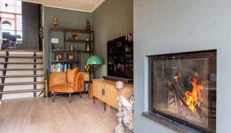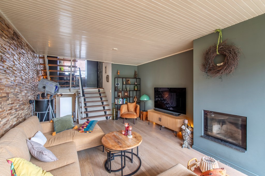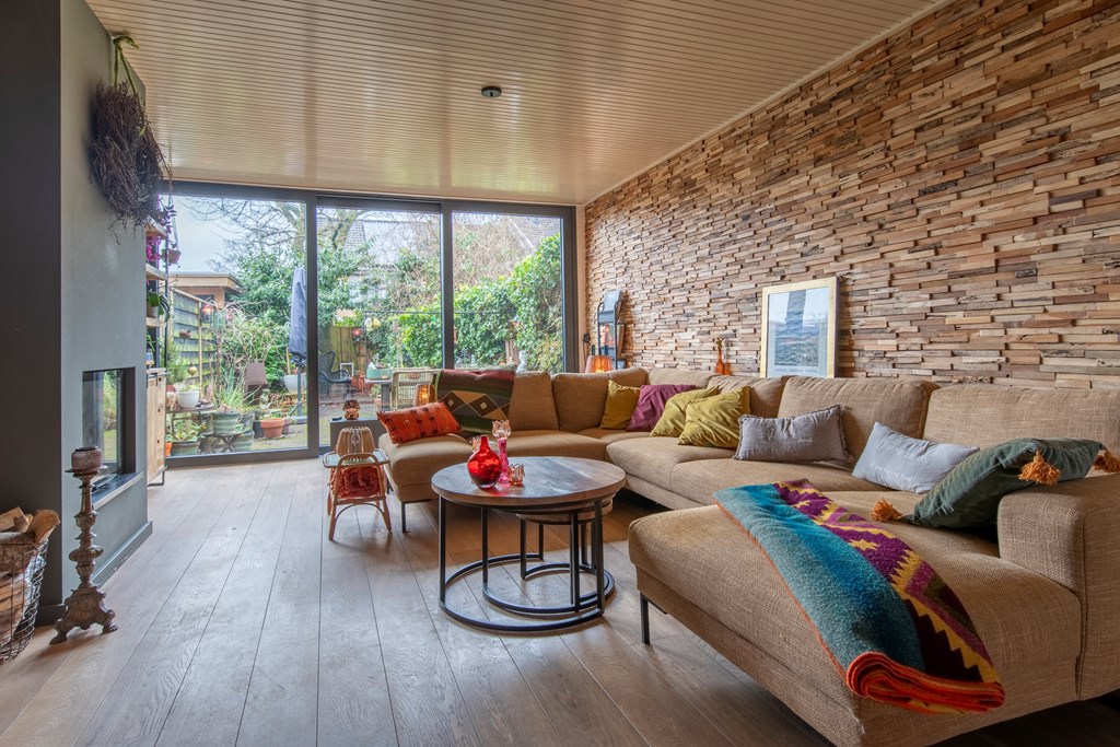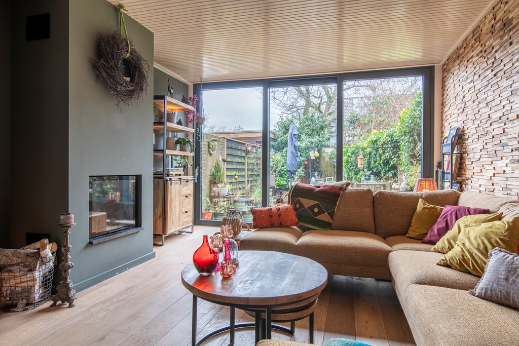Niveau 1: Hier vinden we de fijne woonkamer voorzien van eikenhouten parketvloer die aan de achterzijde van het huis ligt. Wat in de woonkamer opvalt is de aanwezige openhaard. De liefhebbers zal dit zeker aanspreken. Ook valt de fantastische plafondhoogte op wat zorgt voor een heerlijk ruimtelijk gevoel. De in 2025 over de gehele breedte van de gevel geplaatste schuifpui geeft toegang tot de zonnige en besloten achtertuin op het zuidwesten.