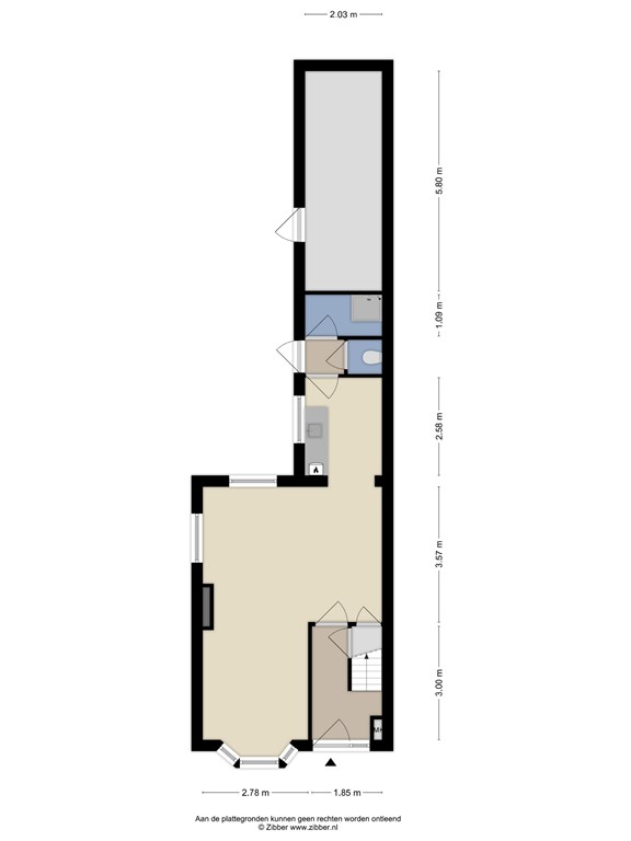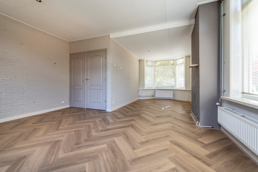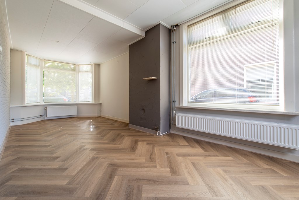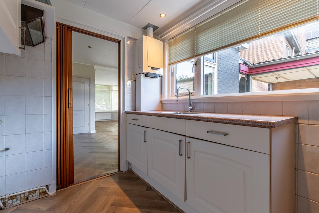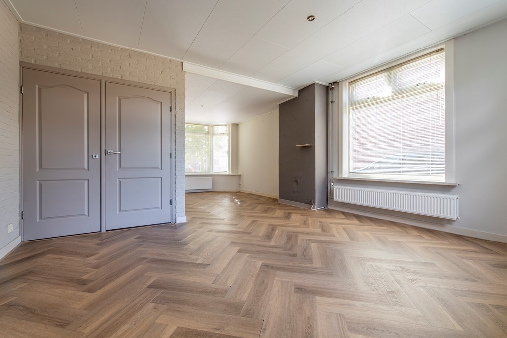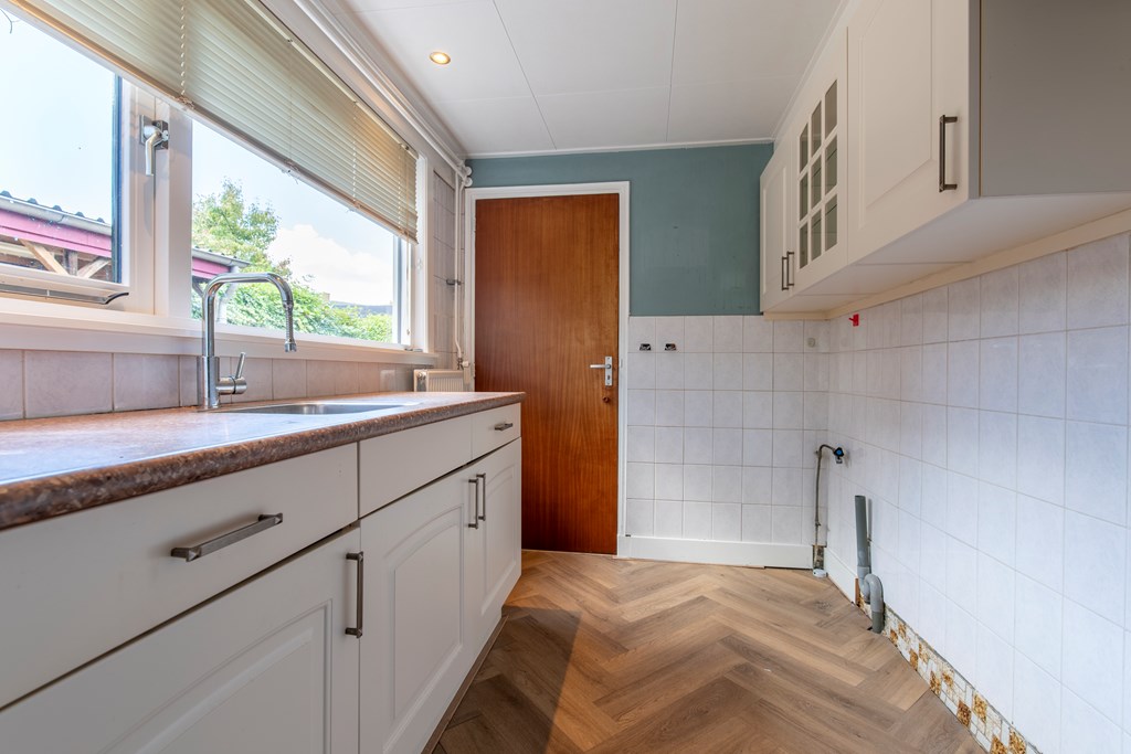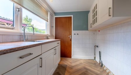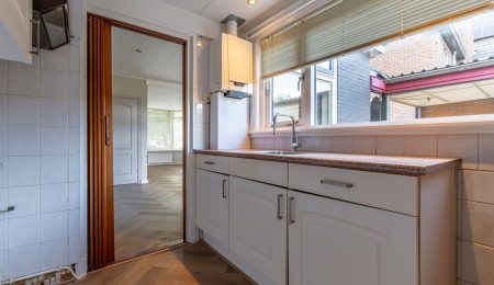 Begane grond: Via de voordeur bereiken we de hal. In deze hal bevindt zich de meterkast, de trapopgang en een trap-/kelderkast. De L-vormige woonkamer heeft aan de voorzijde een charmante erker. De vloer van de woonkamer is afgewerkt met in visgraat motief gelegd PVC. De keuken (waar ook de CV-combiketel is opgesteld) heeft een eenvoudige opstelling en geeft toegang tot het portaal. Dit portaal heeft een deur naar het toilet en naar de badkamer die een douchegelegenheid heeft. Ook geeft het portaal toegang tot buiten.