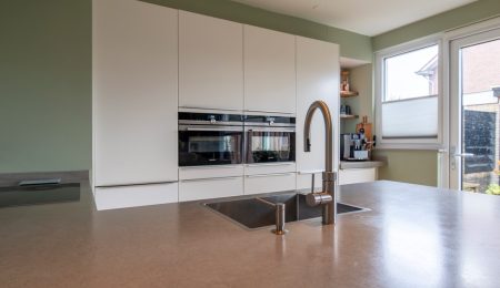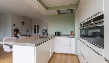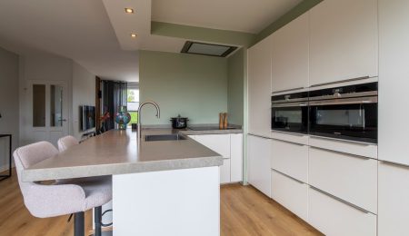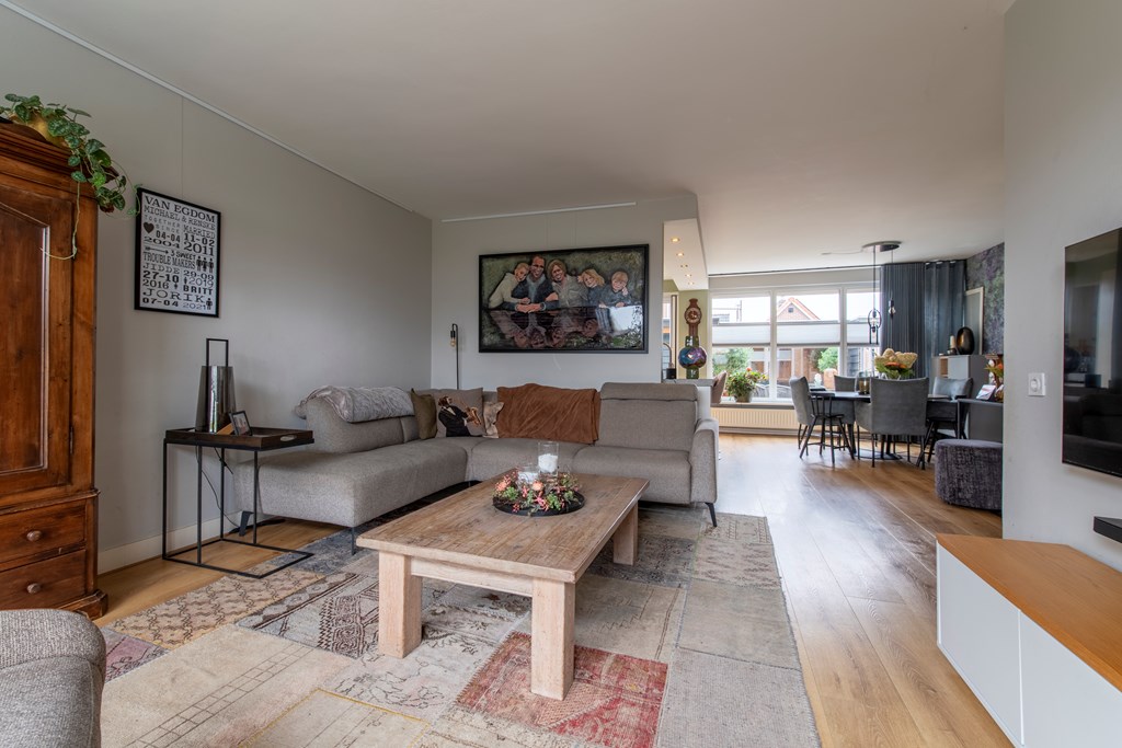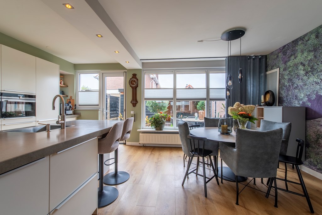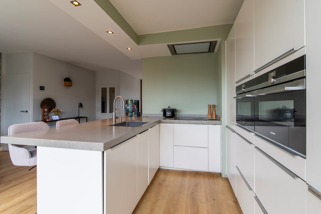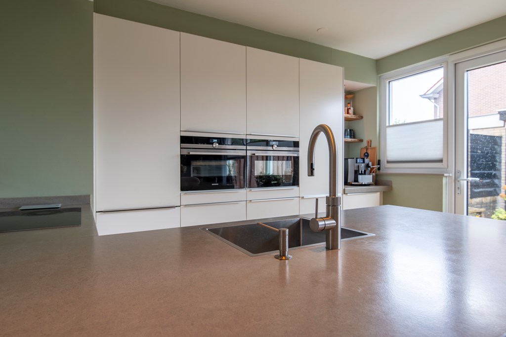 Begane grond: Via de entree bereiken we de hal. Hier zien we de trap naar de eerste verdieping en deuren naar de meterkast en het toilet met een fonteintje. De woonkamer betreft een woonkamer met een Z-vormige indeling. En geloof ons maar, niets is fijner dan dat. Een riant zitgedeelte aan de voorkant van het huis en een praktisch eetgedeelte aan de achterkant, naast de keuken. Over de keuken gesproken, deze keuken heeft een U-vormige opstelling met witte fronten. Het aanwezige barretje wordt door uw kinderen ongetwijfeld gewaardeerd als u aan het koken bent maar resulteert ook in extra kastruimte. Aan inbouwapparatuur is er in de keuken aanwezig een inductie kookplaat, een afzuigkap, een koelkast, een afzonderlijke en extra grote vriezer, een stoomoven, een combi-oven en een Quooker. Completer kan bijna niet.