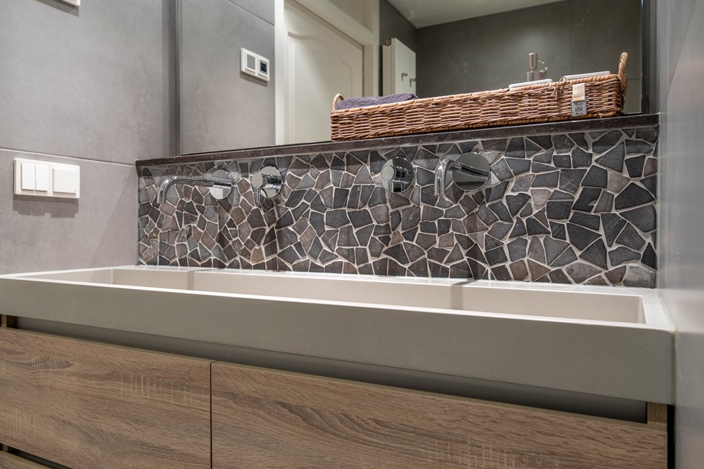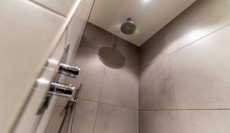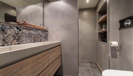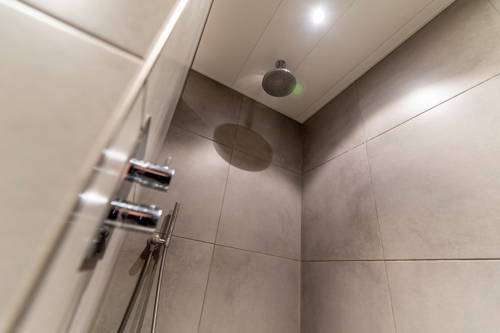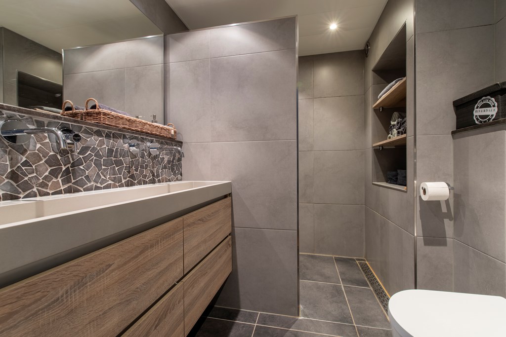 1e Verdieping: De centrale overloop geeft toegang tot 4 slaapkamers. 2 Slaapkamers liggen aan de achterkant van het huis, de resterende 2 slaapkamers waaronder de hoofslaapkamer liggen aan de voorkant van het huis. De badkamer heeft een dubbele wastafel met een wastafelmeubel, een toilet en een inloopdouche met een regendouche.