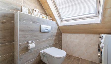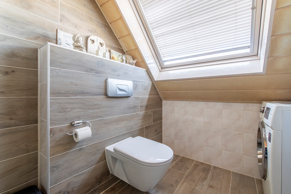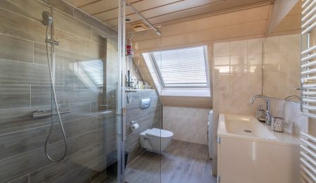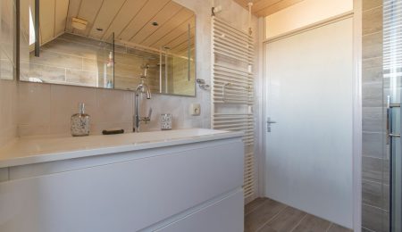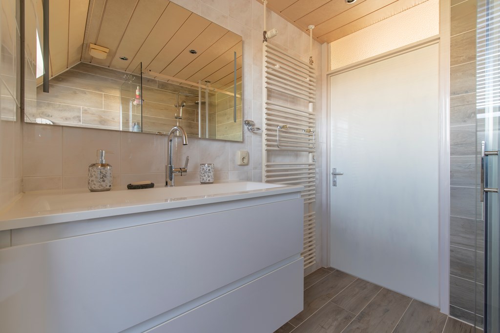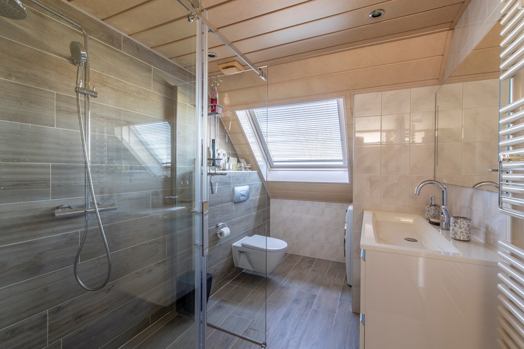 1e Verdieping: Vanaf de overloop kunnen we totaal drie slaapkamers bereiken. Twee slaapkamers, waaronder de hoofdslaapkamer, liggen aan de achterzijde. De derde slaapkamer ligt dus aan de voorkant van het huis, net als de badkamer. Deze badkamer heeft een douchecabine, een toilet, een wastafel met wastafelmeubel en een dakvenster. Ook de wasmachine kan hier worden aangesloten.