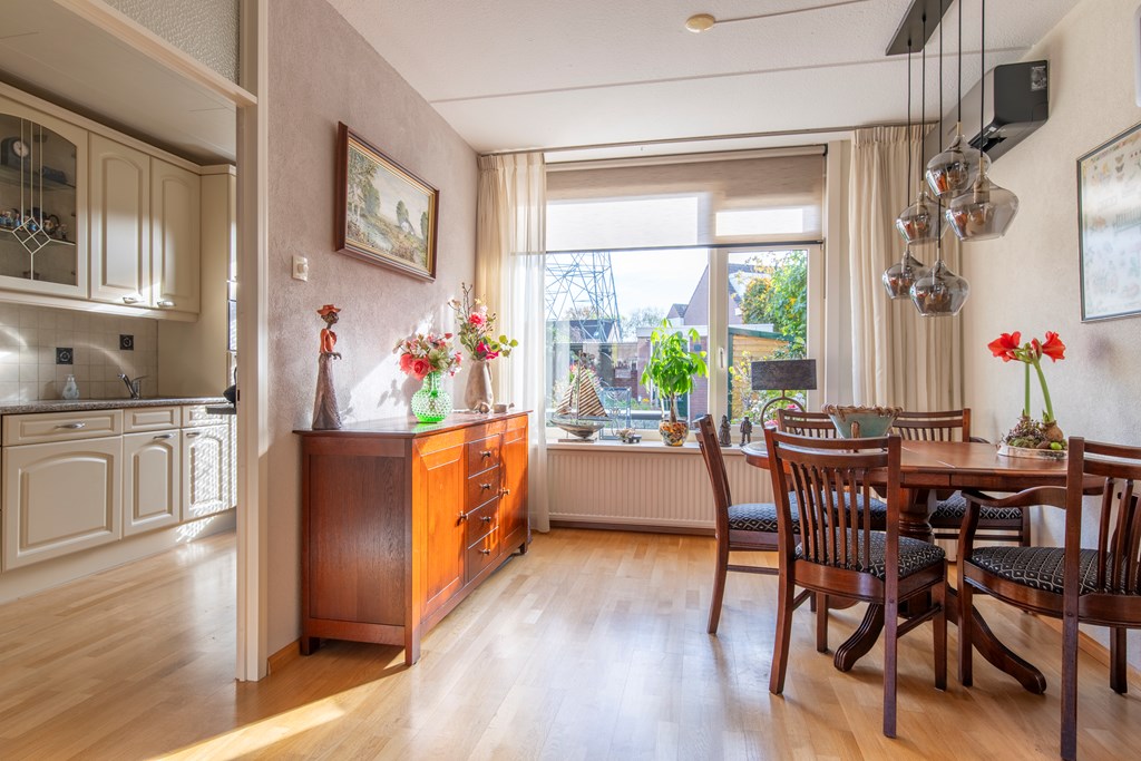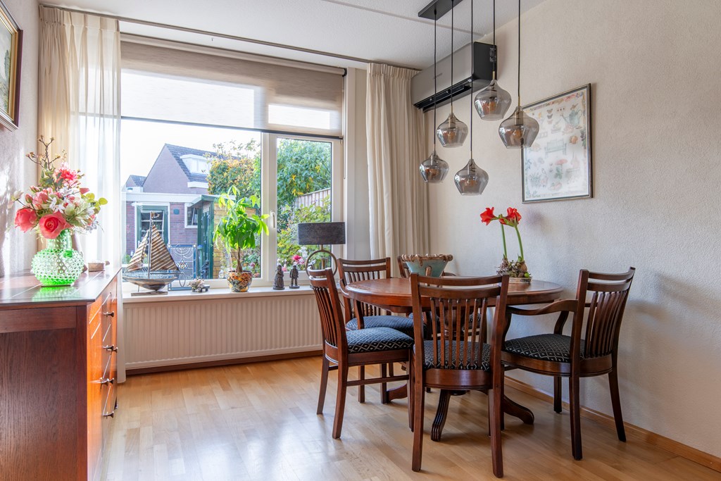 Begane grond: In de hal is er een deur naar het toilet met een fonteintje en een deur naar de meterkast. De trap geeft toegang tot de eerste verdieping. De Z-vormige woonkamer heeft een zithoek aan de voorzijde met een levendig uitzicht op de straat. De eethoek ligt aan de tuinzijde. De dichte keuken heeft een rechte keukenopstelling voorzien van een inductie kookplaat, een afzuigkap, een koelkast, een combi-magnetron en een vaatwasser.