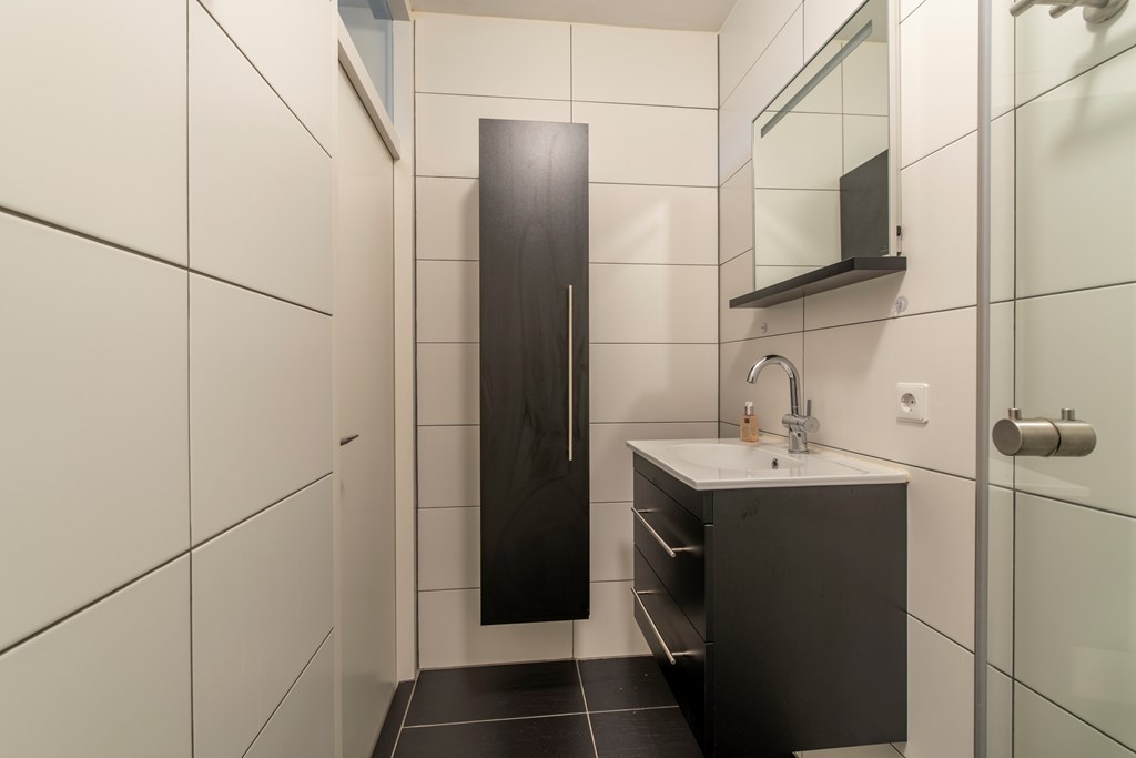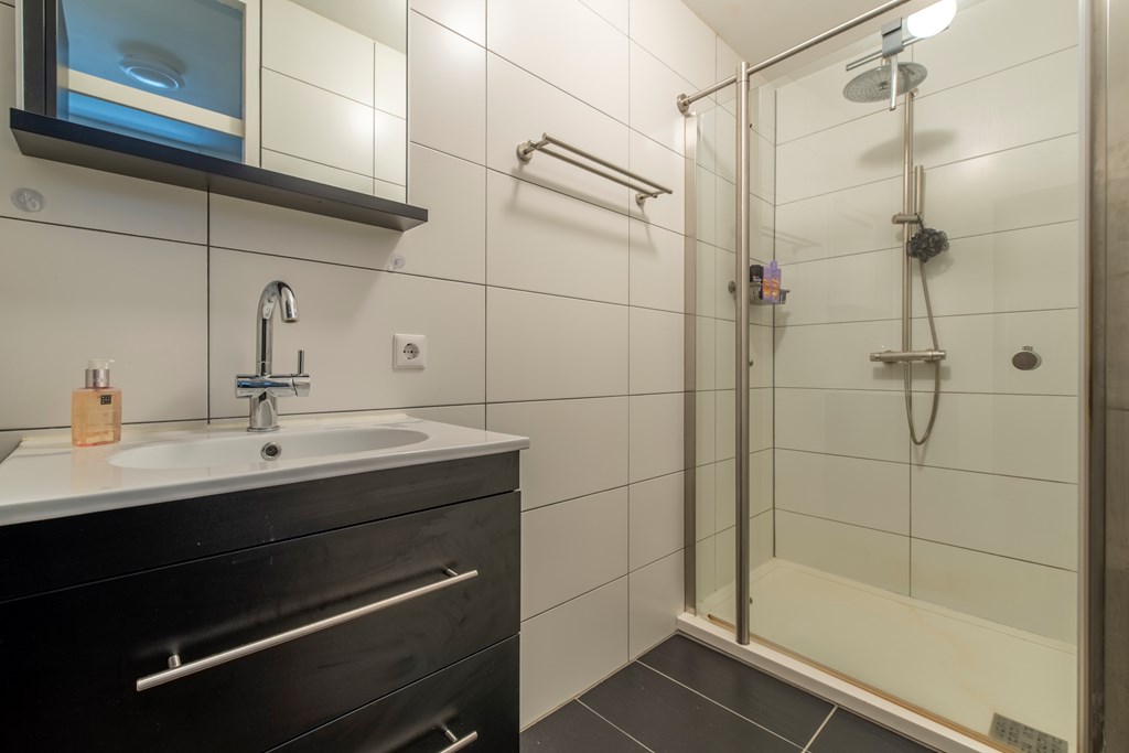 3e Verdieping: De voordeur geeft ons toegang tot de hal. Deze hal heeft een deur naar de meterkast. Wanneer we verder lopen bereiken we de woonkamer. Deze woonkamer, met een prachtig vrij uitzicht, heeft deuren naar het balkon, naar de gang en naar de hoofdslaapkamer. Ook de hoofdslaapkamer heeft een deur naar het ruime balkon. Aan de galerijzijde ligt de half-open keuken. Deze keuken heeft een elektrische kookplaat, een afzuigkap en een oven. Ook de wasmachine kan hier worden aangesloten en de boiler is hier opgesteld. De vanuit de woonkamer bereikbare hal geeft toegang tot de 2e slaapkamer aan de galerijzijde, een bergkast, het eigentijds maar neutraal betegelde toilet met een fonteintje en de badkamer. Deze badkamer heeft een douchecabine en een wastafel met een wastafelmeubel.